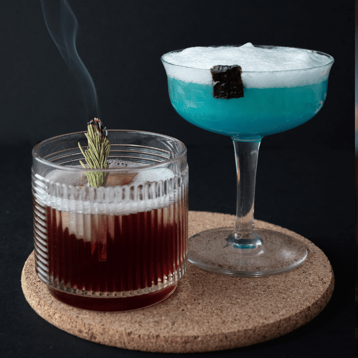 Discover the art of mixology with the Lotus Kit, where East meets innovation in every sip. The “Tranquility” is a vibrant blue cocktail with hints of coconut and lime, crowned with a silky foam and a touch of nori for an unexpected finish. The “Inner Fire” ignites your senses with lapsang souchong tea, tart cherry juice, and maple syrup, served in a rosemary-smoked glass for a daring experience. Add your favorite spirit to round out the experience.