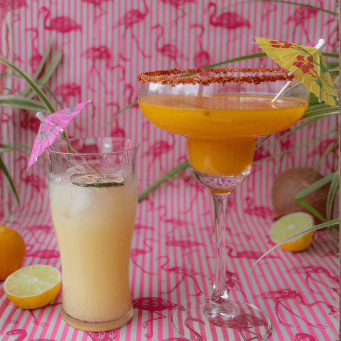 Take a break with these tropical drinks. They invoke the smell of sunscreen and good times. The playfully named “Lime in a Coconut” is a tiki style drink complete with falernum syrup and cocktail umbrellas. The “Sunshine Margarita” embodies good vibes as it bursts with bold flavors. Add your favorite spirit to round out the experience.